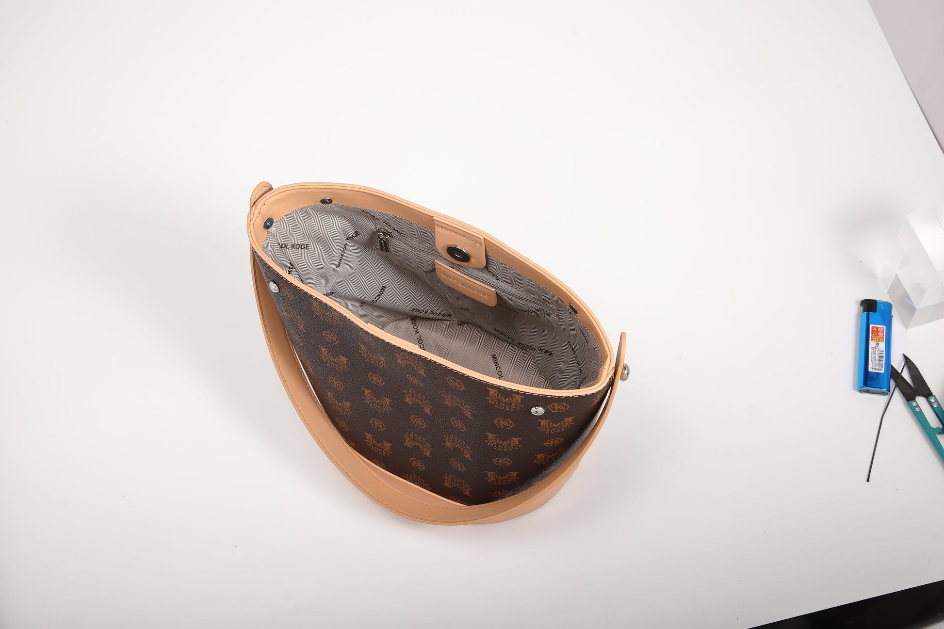 GESSY LOGO PRINT BUCKET BAG IN COFFEE
