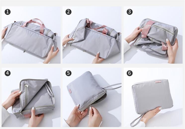 HT-287 GESSY Travel Bag/Gym Bag. It has a strap on the back that can be attached to hand luggage handle and sit on top of hand luggage. It can be folded to very small when it is not in use.